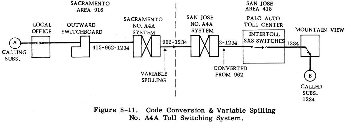Code Conversion and Variable Spill (Figure 8-11) - In this illustration the Sacramento office knows from the card used on this call that San Jose has no need of the 415 area code because the call will complete in that area, therefore, the Sacramento office omits the 415 when spilling forward to San Jose. This illustrates the variable spill feature. At San Jose the card used indicates that Palo Alto requires only 2-1234 for switching this call so the card indicates that the 962 or the central office code Y0-2 should be ''Code Converted" to a 2.